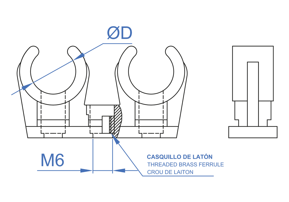 Doppelklemme, mit Messingbuchse M6. Ermöglicht das parallele Klemmen von leichten Kabeln oder Rohren aus Stahl, Kupfer oder PVC. Die Rohre werden durch Druck in Position gehalten. Kann mit Stecker und Schraube, auf Schiene oder mit Schraube und metrischem Gewinde montiert werden. Sie besteht aus Polypropylen und ist halogenfrei.
