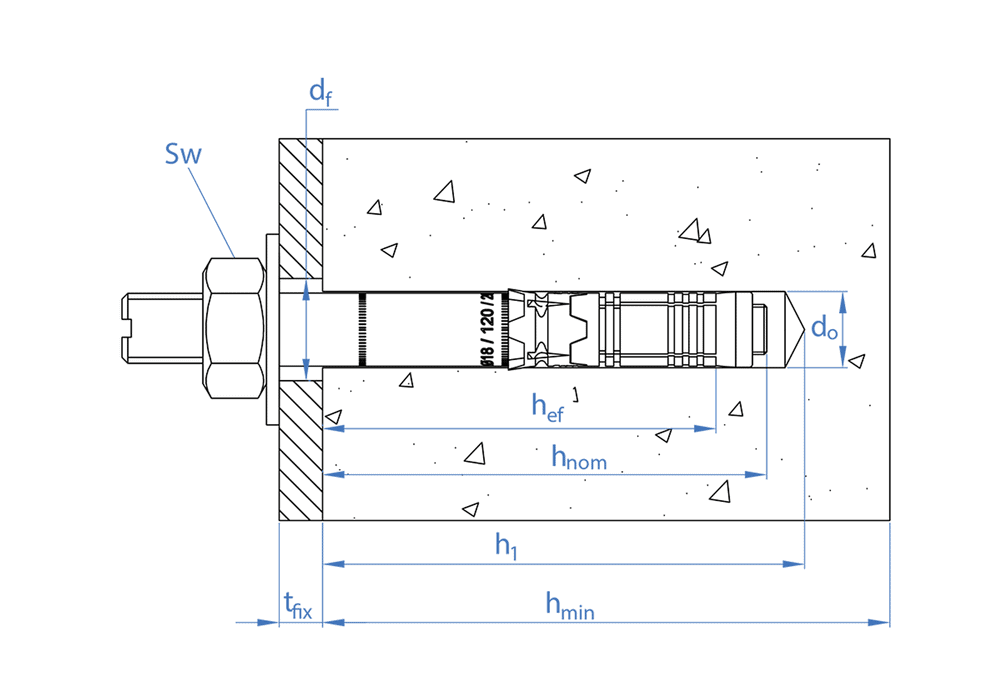 tfix - Dicke des Anbauteils 160 SW - Schlüsselweite 30 df - Ø Durchgangsbohrung im Anbauteil 31 Tins - Montagedrehmoment (Nm) 240 hef - Effektive Verankerungstiefe 125 hnom - Gesamtlänge des Ankers im Beton 146 h1 - Min. Bohrlochtiefe 160 d0 - Ø Bohrdurchmesser 28 hmin - Min. Dicke des Anbauteils 250 L - Länge 310