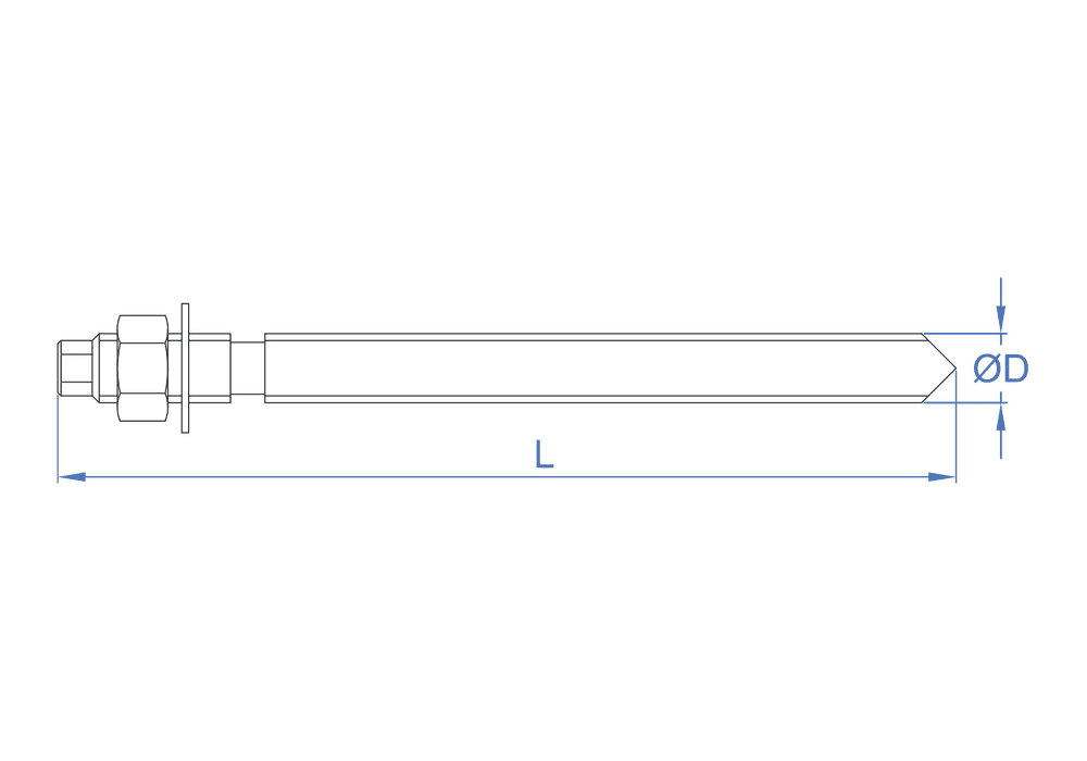 Threaded stud with nut and washer for chemical studs. It is made of A4 stainless steel, a material that allows it to be used in particularly demanding conditions such as marine environments. It is compatible with all chemical anchors in the INDEX catalogue.