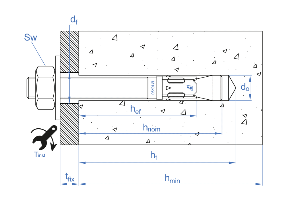 tfix - Max. fixture thickness 13 SW - Installation key 17 df - Ø Element to fix 12 Tins - Torque (Nm) 35 hef - Effective depth 42 hnom - Min. anchor depth 54 h1 - Drill hole depth min. 60 d0 - Ø Drill 10 hmin - Min. substrate thickness 100 L - Lenght 80 AM10090 M10 x 90 Ø10 10 110 0 100 400 8423533010902