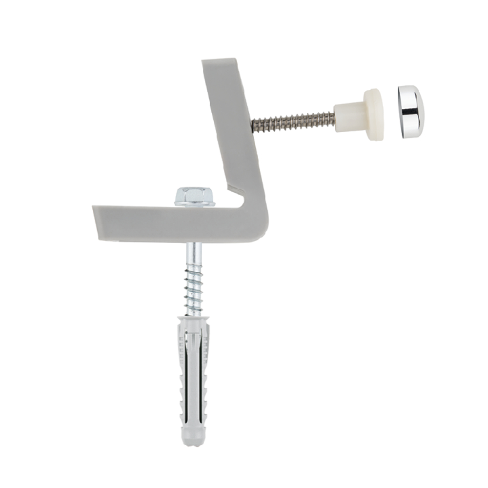 Horizontal fixing kit for toilets or bidets. Includes two nylon brackets; two TN4S nylon plugs; two small A2 stainless steel screws; two large zinc-plated steel screws; two chrome plugs and two nylon plugs. Allows sanitary ware to be fixed to the floor quickly and easily.