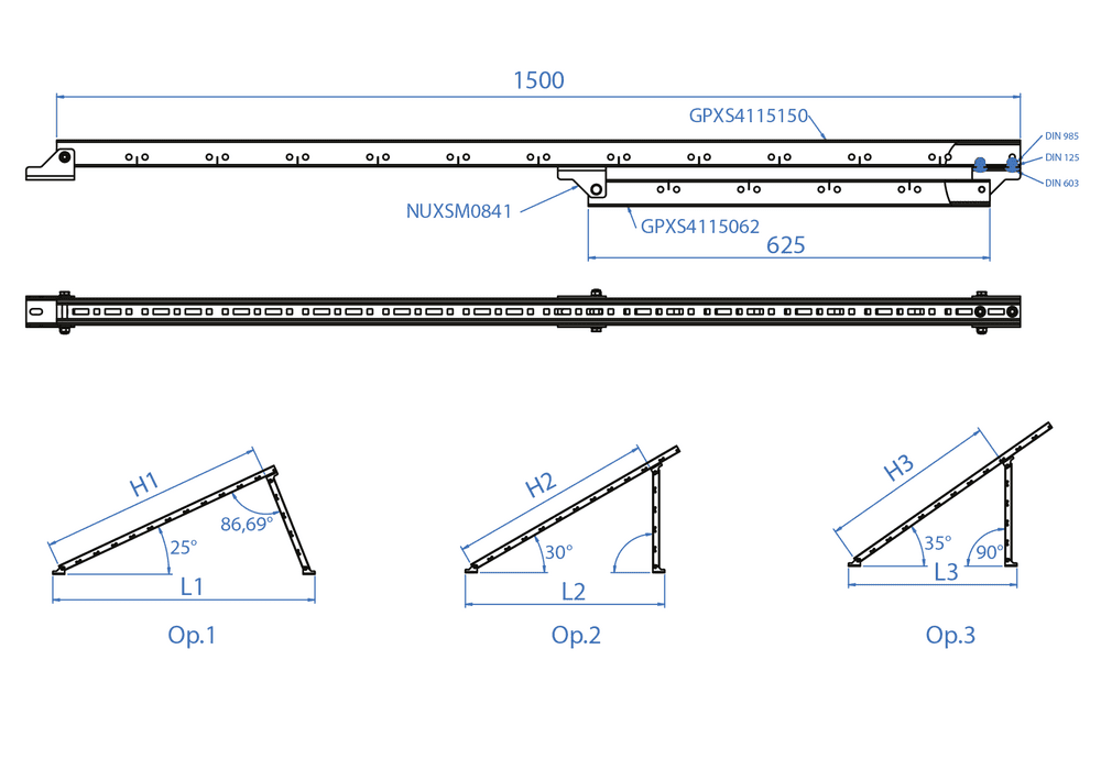 INDEXTRUT adjustable triangle for mounting solar panels on roofs. It can be used together with the GP-XS perforated guides for the installation of panels in continuous format. It comes pre-assembled and consists of two INDEXTRUT perforated guides and three INDEXTRUT articulated nodes. It includes screws D603I08016 and nuts D6923IM08 for fixing. The panels can be installed at an angle of 25º and 35º. The profiles are made of aluminium and the nuts and screws are made of A2 stainless steel.