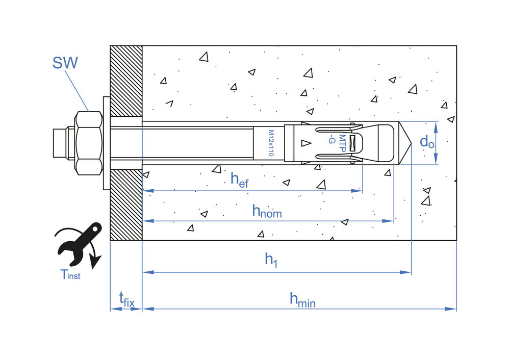 tfix - Épaisseur max. à fixer 62 SW - Schlüsselweite 30 df - Ø Élément à fixer 22 Tins - Tins - 200 hef - Profondeur effective 100 hnom - Min. profondeur cheville 114 h1 - Profondeur min. de perçade 125 d0 - Ø Foret 20 hmin - Min. épaisseur du support 200 L - Longueur 200