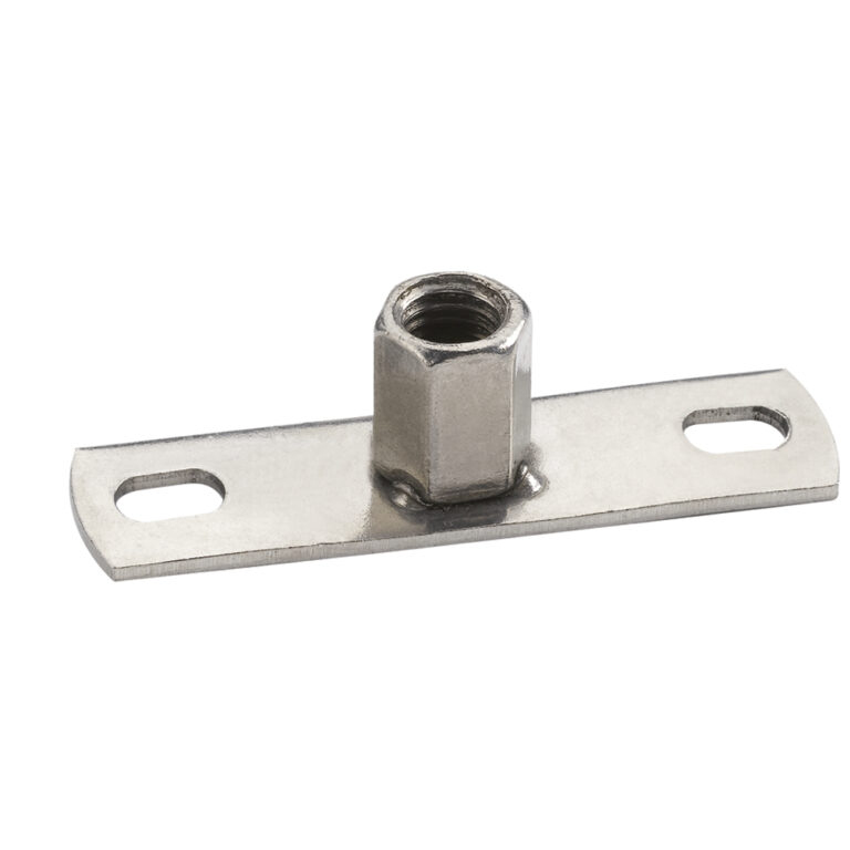 Piastra per il fissaggio di barre filettate. Incorpora una filettatura metrica femmina per il montaggio della barra e due fori per il fissaggio su tetti o altre strutture. Consente l’installazione di elementi come controsoffitti o sistemi di tubazioni. È realizzata in acciaio inossidabile, un materiale molto resistente alla corrosione.