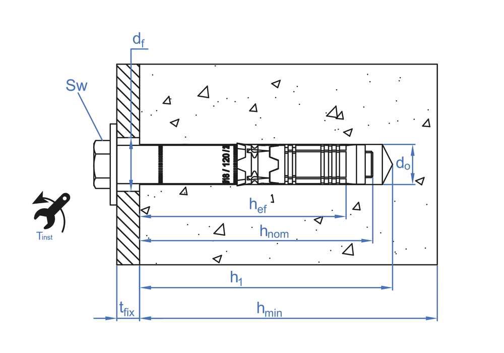 tfix - Spessore max da fissare 10 SW - Chiave di installazione 19 df - Ø Elemento da bloccare 20 Tins - Coppia di serraggio (Nm) 80 hef - Profondità effettiva 85 hnom - Profondità min. dell'ancoraggio 97 h1 - Profondità min. di perforazione 110 d0 - Punta da trapano Ø 18 hmin - Spessore min. del materiale di base 170 L - Lunghezza 110 SLPT18120 M12 x 120 Ø18 20 170 0 20 80 8423533827883