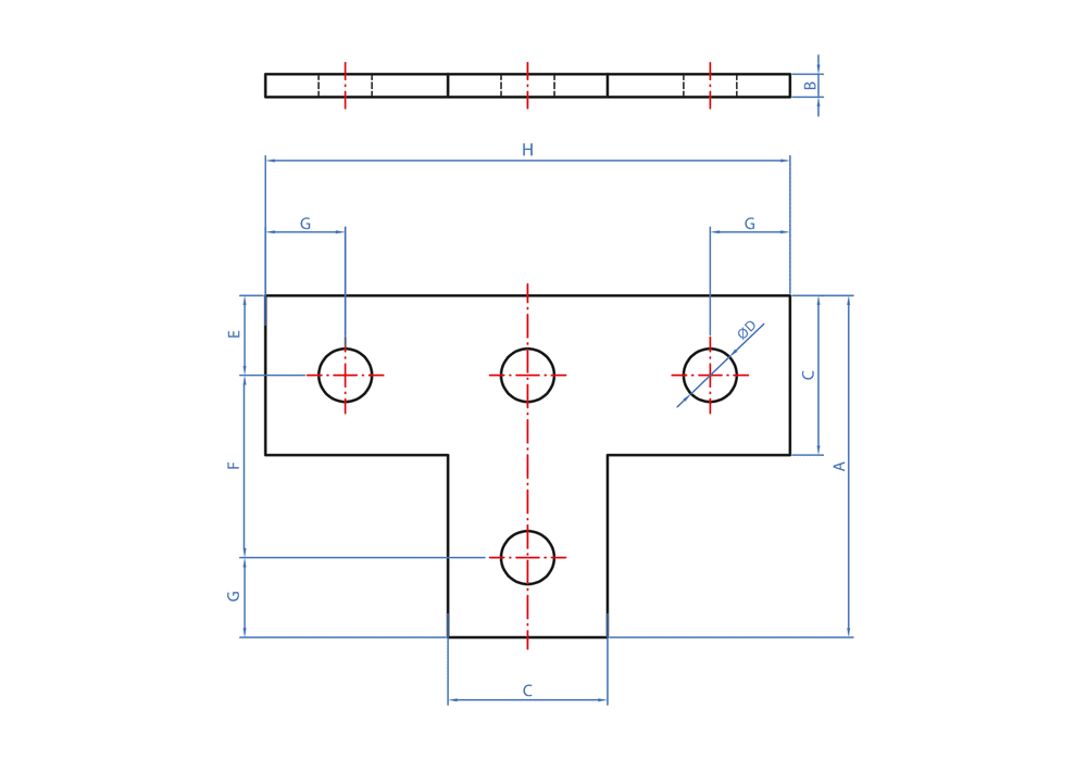 Piastra di unione a forma di “T” per guide Indextrut. Permette di collegare le guide perforate in modo perpendicolare con viti esagonali e dadi. La sua struttura ha quattro fori. Assicura un fissaggio sicuro e resistente dei profili in diversi tipi di installazioni. È fatta di acciaio zincato.