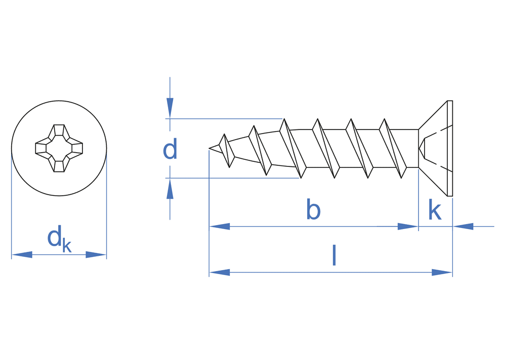 Tornillo para PVC, con cabeza avellanada y huella PH. Se emplea para fijar herrajes sobre perfiles de PVC o como tornillo de reparación para uniones en las que el tornillo PVC-10 se ha pasado de rosca. Cuenta con una rosca de 40º para plásticos y punta de tipo S, que permite perforar de forma directa el PVC y otros plásticos. Está fabricado en acero con recubrimiento bricomatado.