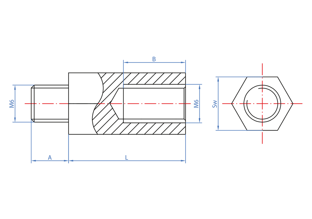 Manguito macho hembra. Incorpora una rosca interior métrica en un extremo y un espárrago roscado en el otro. Es especialmente útil en el montaje de cuadros eléctricos. Está fabricado en acero con recubrimiento zincado.