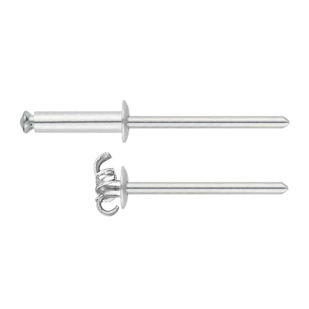 Remache de flor con cabeza alomada. Está diseñado para unir entre sí elementos metálicos o de otros materiales con facilidad. Su expansión en forma de flor permite fijar elementos de baja resistencia sin dañarlos. El cuerpo es de aluminio y el vástago de acero zincado.