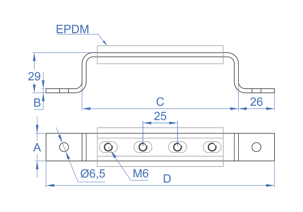 Soporte para abrazaderas puente isofónicas, diseñado para instalar tuberías ligeras en paralelo. Permite el montaje de dos o más abrazaderas para tubos (según el modelo) en instalaciones de saneamiento, gas o eléctricas, entre otras. Cuenta con dos puntos de anclaje para una fijación resistente al material base. Incorpora goma aislante de EPDM, que reduce las vibraciones y el sonido. Está fabricado en acero zincado.
