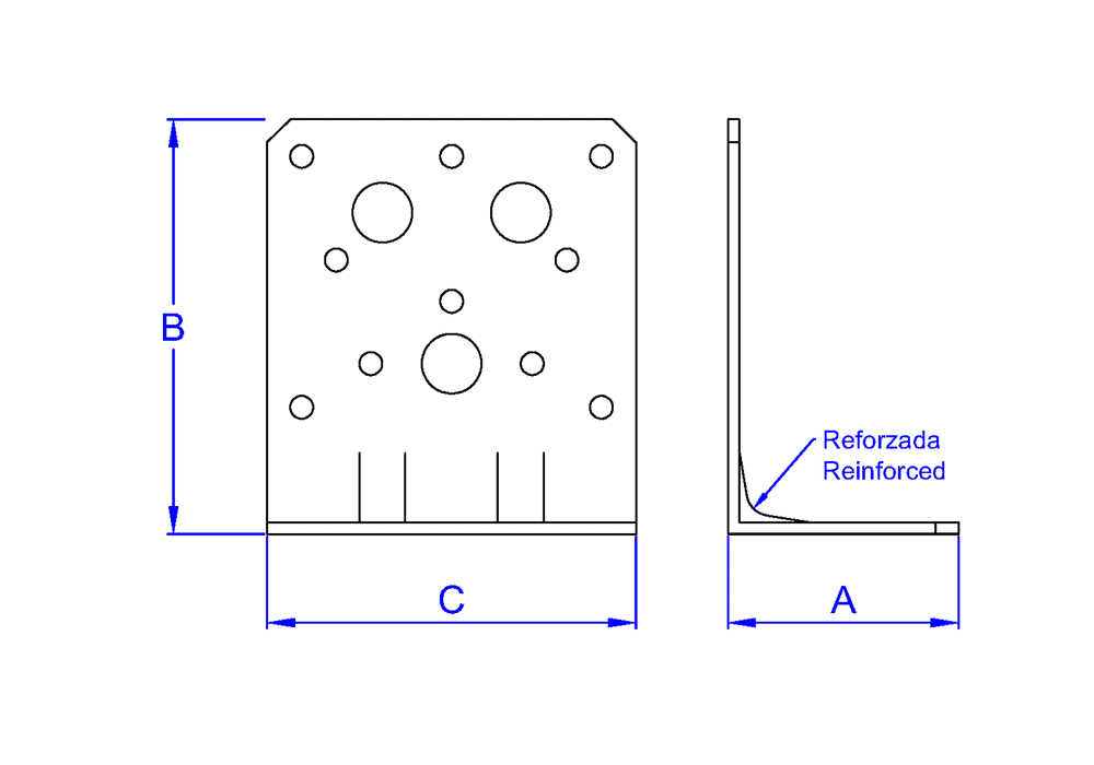 • [ESCUADRA REFORZADA] Escuadra reforzada para uniones exigentes entre piezas de madera, madera y hormigón o madera y acero. Cada cara combina orificios de distinto diámetro.