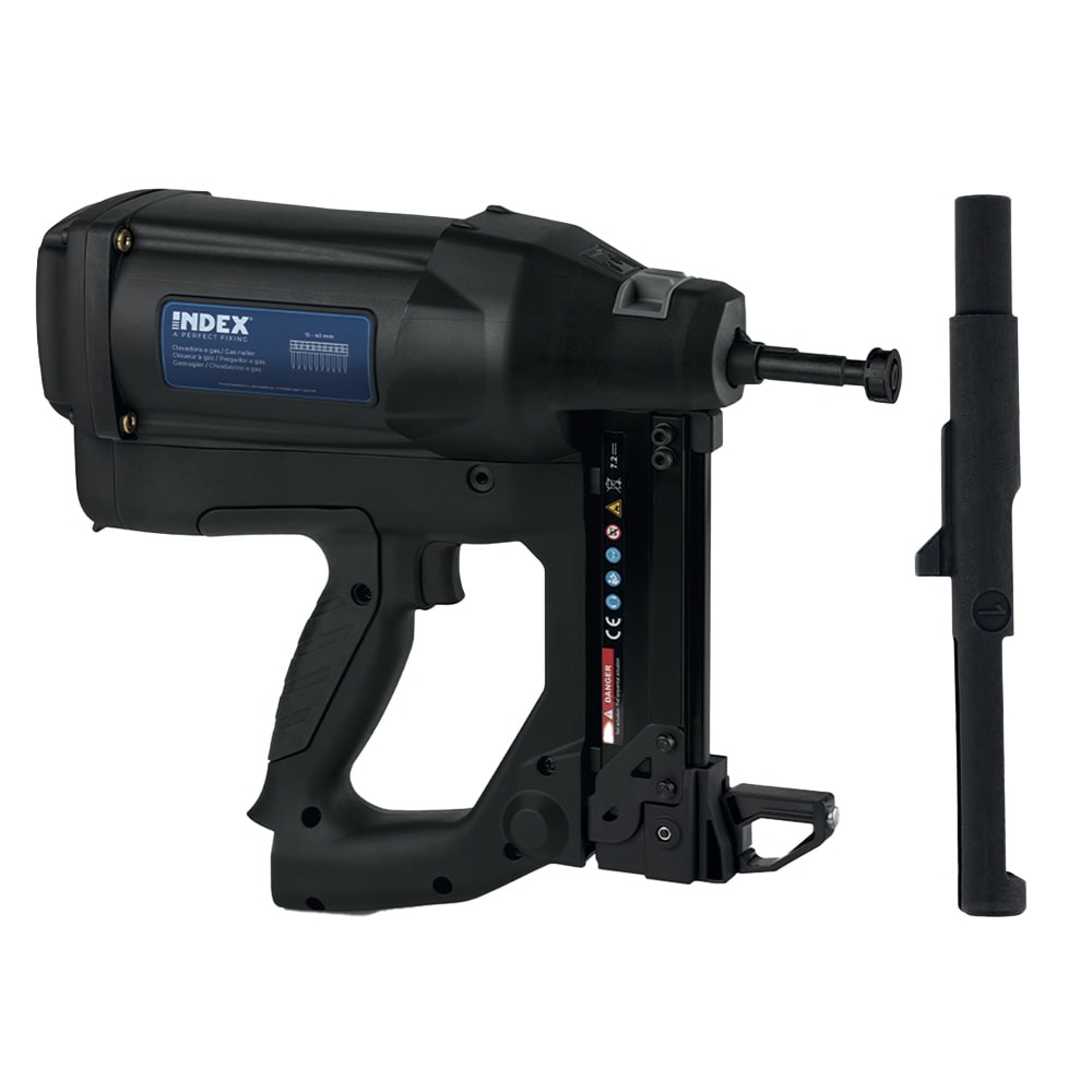 Pistola de clavos a gas, semiautomática y sin cables. Permite una instalación fácil y rápida de canales o angulares en el montaje de placas de yeso laminado. Cuenta con dos baterías de litio de gran capacidad.