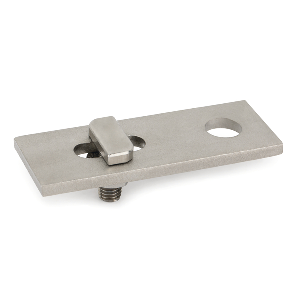 Placa de montaje para fijar estructuras para paneles solares sobre distintos tipos de cubiertas. Permite conectar el perfil de aluminio PSE-A a tornillos de doble rosca anclados a la subestructura. Incluye un conector cruzado inferior, que permite fijar la placa de montaje a la parte inferior del perfil. La placa y los elementos de fijación están fabricados en acero inoxidable A2.
