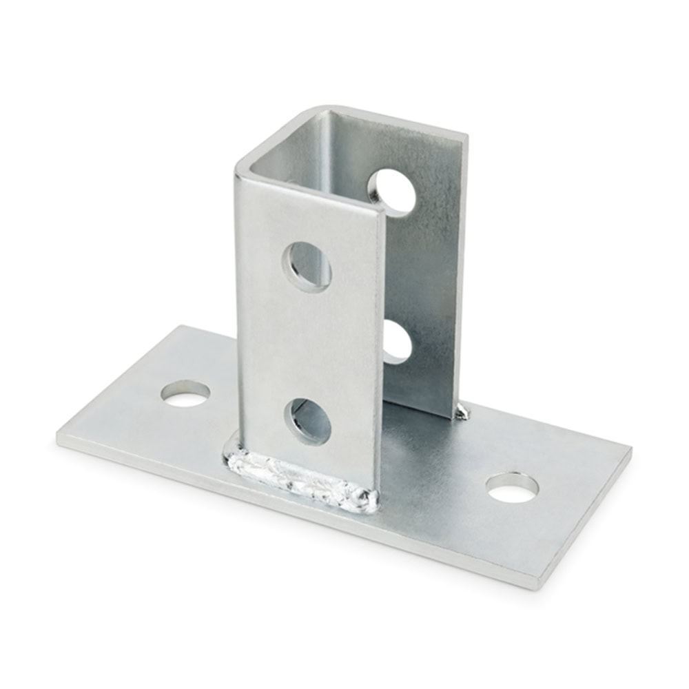 Suporte retangular, feito para fixar perfis Indextrut para cargas pesadas em paredes ou pisos. Permite conectar o perfil de forma rápida e segura com porcas e parafusos hexagonais. Pode ser usado para instalar elementos como braçadeiras para tubos ou bandejas porta-cabos. É feito de aço com revestimento zincado.